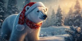 Majestic Polar Bear in Winter Wonderland. A powerful polar bear stands on a frozen lake surrounded by snow-covered mountains and trees. Perfect for wildlife, nature, and winter themes.