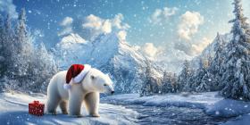 Majestic Polar Bear in Winter Wonderland. A powerful polar bear stands on a frozen lake surrounded by snow-covered mountains and trees. Perfect for wildlife, nature, and winter themes.