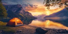 Camping by a Mountain Lake at Sunset. A tent glows with warm light near a serene lake with stunning mountain views. Perfect for camping, nature, and travel themes.