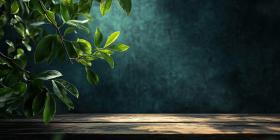 Spring Morning Tabletop Scene. Wooden table with blooming branches and a sunlit forest background. Perfect for nature, spring, and product display themes.
