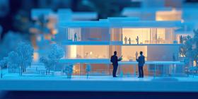 Intricate Architectural Scale Model Depicting a Modern Multi-Story Building with Lively Human Activity and Landscaped Surroundings