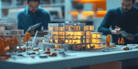 Intricate Architectural Scale Model Depicting a Modern Multi-Story Building with Lively Human Activity and Landscaped Surroundings