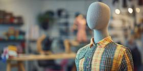 Mannequin Display in Clothing Store. A mannequin wearing a plaid shirt in a stylish shop interior. Perfect for fashion, retail, and store design themes.