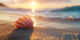 Seashell at Sunset on a Sandy Beach. A seashell sits on the sand with a vibrant sunset in the background. Perfect for beach, travel, and nature themes.