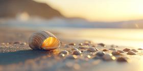 Seashell at Sunset on a Sandy Beach. A seashell sits on the sand with a vibrant sunset in the background. Perfect for beach, travel, and nature themes.