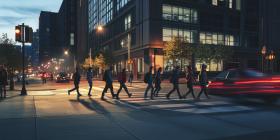 Morning Commute: Pedestrians Crossing a City Street in Warm Sunlight