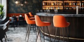 Modern Restaurant Interior with Colorful Chairs. Stylish dining space with large windows and a vibrant color scheme. Perfect for food, interior design, and restaurant themes.