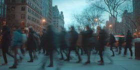 Morning Commute: Pedestrians Crossing a City Street in Warm Sunlight