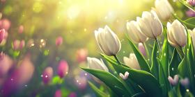 White Tulips in Sunlight. A field of blooming white tulips with a warm, sunny glow. Perfect for spring, nature, and floral themes.