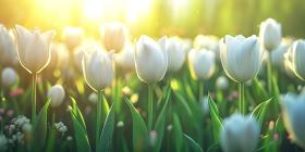 White Tulips in Sunlight. A field of blooming white tulips with a warm, sunny glow. Perfect for spring, nature, and floral themes.