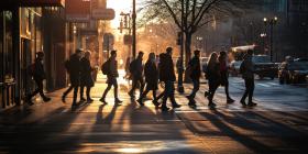 Morning Commute: Pedestrians Crossing a City Street in Warm Sunlight