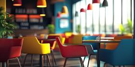 Modern Restaurant Interior with Colorful Chairs. Stylish dining space with large windows and a vibrant color scheme. Perfect for food, interior design, and restaurant themes.
