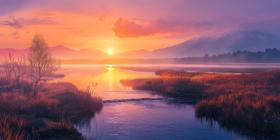 Serene Sunset Landscape. A breathtaking scene with a waterfall, blooming flowers, and a vibrant sunset over a mountain range. Perfect for nature, travel, and serenity themes.