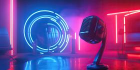 Retro Microphone on Stage. Vintage microphone illuminated by red spotlights on a dark stage. Perfect for music, performance, and entertainment themes.