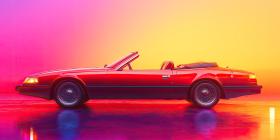 Vintage Sports Car at Sunset. A classic red convertible parked on a rooftop overlooking a city skyline at sunset. Perfect for automotive, luxury, and cityscape themes.