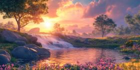 Serene Sunset Landscape. A breathtaking scene with a waterfall, blooming flowers, and a vibrant sunset over a mountain range. Perfect for nature, travel, and serenity themes.