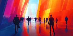 Dynamic Outdoor Gathering: People Walking and Running in Colorful Outfits Under a Sunny Sky