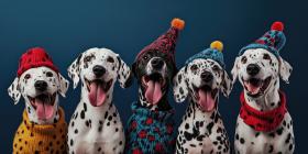 Party Time for Dalmatians. Five adorable Dalmatians wearing party hats and smiling for the camera. Perfect for birthday, celebration, and dog themes.