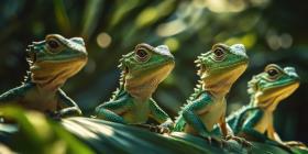 Colorful Lizards on a Branch. Four vibrant lizards perched on a branch in a lush green forest. Perfect for wildlife, nature, and exotic themes.