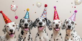 Party Time for Dalmatians. Five adorable Dalmatians wearing party hats and smiling for the camera. Perfect for birthday, celebration, and dog themes.