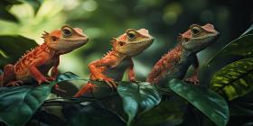 Colorful Lizards on a Branch. Four vibrant lizards perched on a branch in a lush green forest. Perfect for wildlife, nature, and exotic themes.