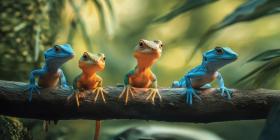 Colorful Lizards on a Branch. Four vibrant lizards perched on a branch in a lush green forest. Perfect for wildlife, nature, and exotic themes.