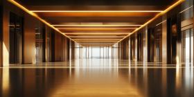 Luxury Hotel Corridor with Golden Accents. A grand hallway with a polished floor, golden ceiling lights, and a view of the city. Perfect for luxury, architecture, and interior design themes.