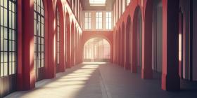 Luxury Hotel Corridor with Golden Accents. A grand hallway with a polished floor, golden ceiling lights, and a view of the city. Perfect for luxury, architecture, and interior design themes.