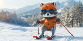 Skiing Hamster in Snowy Mountains. A cute hamster enjoying a winter adventure on skis with a stunning mountain backdrop.