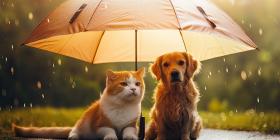 Shelter from the Storm. A cat and dog share a red umbrella in the pouring rain.