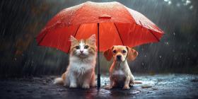 Shelter from the Storm. A cat and dog share a red umbrella in the pouring rain.