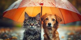 Shelter from the Storm. A cat and dog share a red umbrella in the pouring rain.