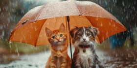 Shelter from the Storm. A cat and dog share a red umbrella in the pouring rain.