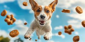 Dog Treat Frenzy. A dog leaps through the air with flying dog biscuits.
