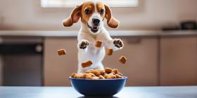 Dog Treat Frenzy. A dog leaps through the air with flying dog biscuits.
