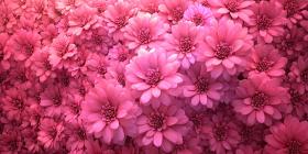 Sunset Daisy Field. A field of pink daisies glowing in the warm light of the setting sun.