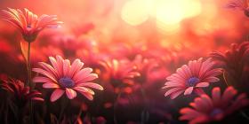 Sunset Daisy Field. A field of pink daisies glowing in the warm light of the setting sun.