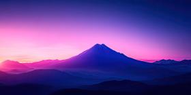 Surreal Mountain Range at Twilight. A panoramic view of a majestic mountain range bathed in a vibrant purple and blue light, evoking a sense of otherworldly beauty.