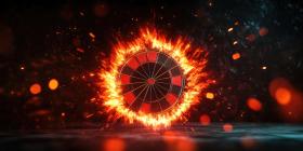 Dynamic Dartboard with Glowing Arrows and Cosmic Background