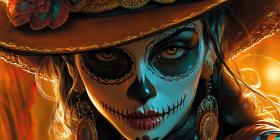 Elegant Portrait: Person with Long, Dark Hair in Ornate Hat and Red Garment Set Against a Fiery Background