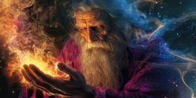 Dark Sorcerer: Figure in Tattered Robe with Flowing Beard and Pointed Hat, Casting a Fiery Spell in a Smoky, Mystical Atmosphere