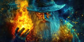 Dark Sorcerer: Figure in Tattered Robe with Flowing Beard and Pointed Hat, Casting a Fiery Spell in a Smoky, Mystical Atmosphere
