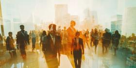 Vibrant Urban Scene: People Walking on a Street at Sunrise/Sunset with Dramatic Shadows and Reflections
