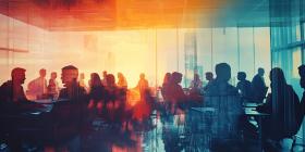 Vibrant Urban Scene: People Walking on a Street at Sunrise/Sunset with Dramatic Shadows and Reflections