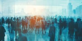 Vibrant Urban Scene: People Walking on a Street at Sunrise/Sunset with Dramatic Shadows and Reflections