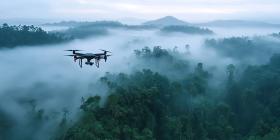 Drone Soaring Above a Misty Rainforest, Capturing the Wilderness from Above.