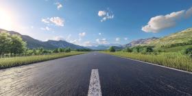 Scenic Road Winds Through a Vast Landscape, Leading Towards Majestic Mountains.