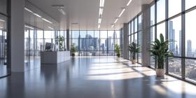 Modern Office Space with Floor-to-Ceiling Windows and Cityscape Views.