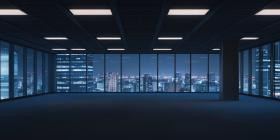 Modern Office Space with Floor-to-Ceiling Windows and Cityscape Views.