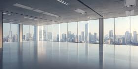 Modern Office Space with Floor-to-Ceiling Windows and Cityscape Views.